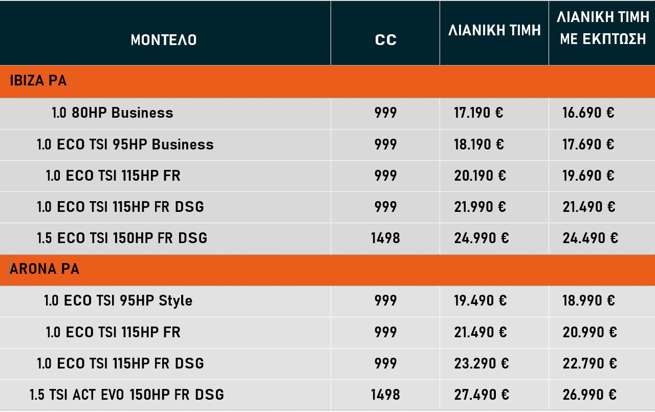 Διαθέσιμα είναι πλέον στην ελληνική αγορά τα ανανεωμένα SEAT Ibiza και SEAT Arona, με την ελληνική αντιπροσωπεία να ανακοινώνει τις εξαιρετικά ανταγωνιστικές τιμές και τις εκδόσεις των δύο best seller της ισπανικής εταιρίας, που επέστρεψαν στο προσκήνιο με εμφανείς βελτιώσεις στη σχεδίαση, την ποιότητα κατασκευής και τον στάνταρ εξοπλισμό.