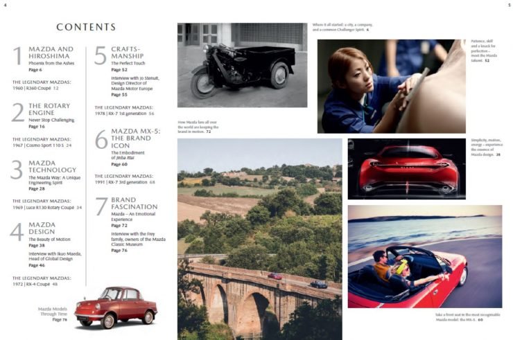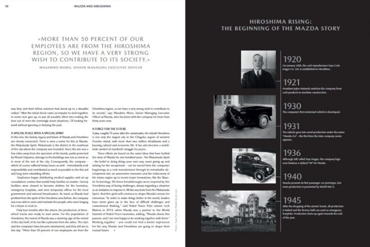 Όλη η ιστορία της θρυλικής μάρκας φιλοξενείται σε ένα πολύ όμορφο αφιέρωμα που ετοιμάστηκε από την Mazda Motor Europe. Ξεκινώντας από την πόλη καταγωγής της μάρκας, την ηρωική Χιροσίμα, οι σελίδες του βιβλίου μας ξεναγούν σε όλα τα σημαντικά γεγονότα που χάραξαν την 100ετή ιστορία της μάρκας.