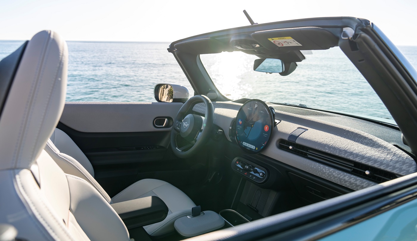 Στο μινιμαλιστικό εσωτερικό του MINI Cooper Cabrio S κυριαρχούν κομψά τονισμένες λεπτομέρειες και υφασμάτινες επιφάνειες. Το τιμόνι, η κλασική, πρόσφατα σχεδιασμένη μπάρα διακοπτών και η κεντρική οθόνη OLED αποτελούν τα τρία βασικά στοιχεία του cockpit. Χάρη στο λειτουργικό MINI OS 9, το infotainment διαθέτει συνδεσιμότητα υψηλής ταχύτητας, προαιρετική δυνατότητα σύνδεσης 5G και over-the-air αναβαθμίσεις, ενώ ο έλεγχος γίνεται μόνο μέσω αφής ή φωνητικών εντολών.