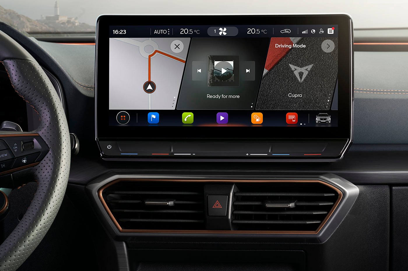 Αλλά η σύνδεση με τον έξω κόσμο είναι αυτό που αποκτά σημασία. Χάρη σε μια ενσωματωμένη κάρτα SIM, το αυτοκίνητο έχει στη διάθεση του την εφαρμογή CUPRA Connect, η οποία φέρνει τα online services απευθείας στο όχημα, επιτρέποντας στους πελάτες να έχουν πρόσβαση σε downloadable apps, σε απευθείας σύνδεση με ραδιόφωνο και σε ένα εκτεταμένο οικοσύστημα λειτουργικότητας με remote data και έλεγχο του οχήματος.